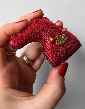 Entièrement brodée à la main, cette broche transforme une simple veste ou un col en manifeste d’imagination industrielle.