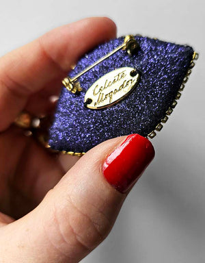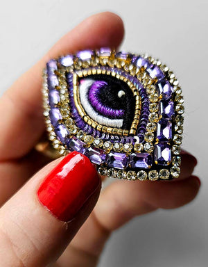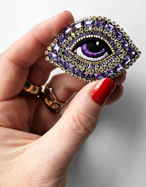 La Broche Œil Céleste est désormais un classique emblématique de la marque Céleste Mogador. Cet accessoire unique présente un œil finement brodé à la main avec des fils de soie colorés.
