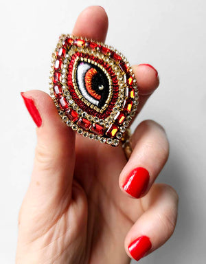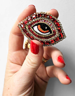 La Broche Œil Céleste est désormais un classique emblématique de la marque Céleste Mogador. Cet accessoire unique présente un œil finement brodé à la main avec des fils de soie colorés.