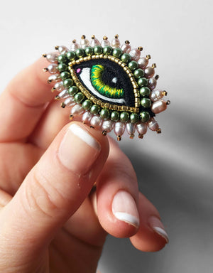 L'œil est délicatement brodé à la main de fils de soie colorés. Une rangée de perles d'eau douce complètent les détails de ce bijou qui deviendra bientôt iconique.