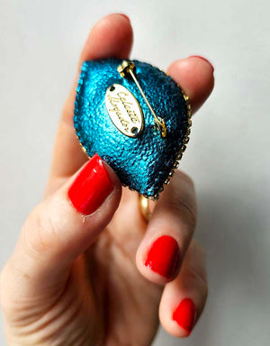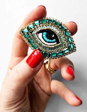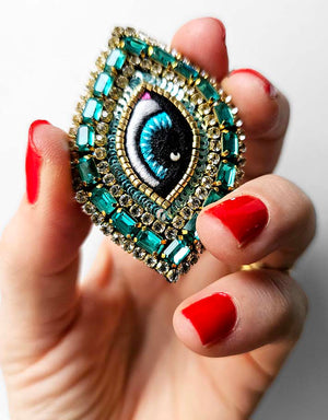 La Broche Œil Céleste est désormais un classique emblématique de la marque Céleste Mogador. Cet accessoire unique présente un œil finement brodé à la main avec des fils de soie colorés.