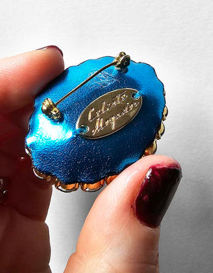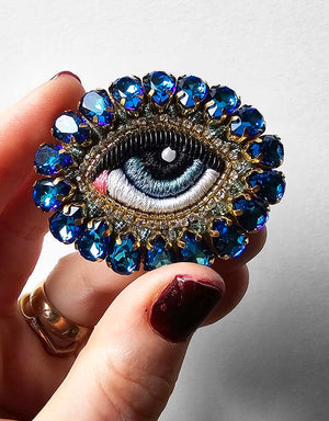 La Broche Œil Céleste est devenue le classique de la marque Céleste Mogador. L'œil est délicatement brodé à la main de fils de soie colorés.