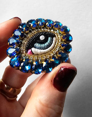 La Broche Œil Céleste est devenue le classique de la marque Céleste Mogador. L'œil est délicatement brodé à la main de fils de soie colorés.