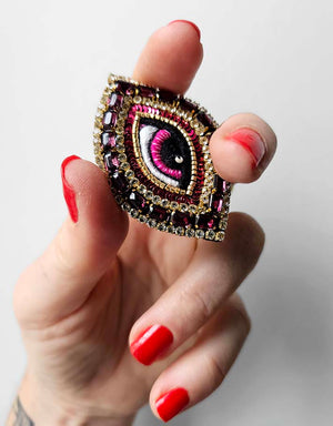 La Broche Œil Céleste est désormais un classique emblématique de la marque Céleste Mogador. Cet accessoire unique présente un œil finement brodé à la main avec des fils de soie colorés.
