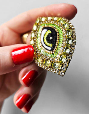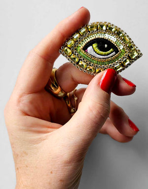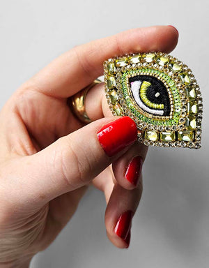 La Broche Œil Céleste est désormais un classique emblématique de la marque Céleste Mogador. Cet accessoire unique présente un œil finement brodé à la main avec des fils de soie colorés.