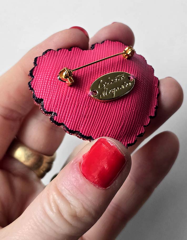 • Dos de la broche: épingle et fermoir doré, logo: plaque dorée Céleste Mogador