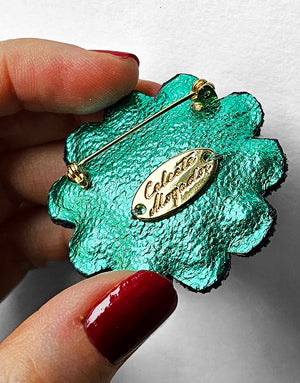 • Dos de la broche: épingle et fermoir plaqué or, logo: plaque dorée Céleste Mogador