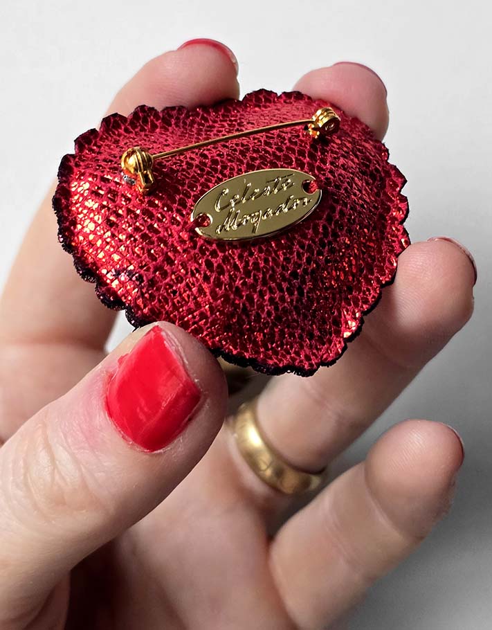 • Dos de la broche: épingle et fermoir doré, logo: plaque dorée Céleste Mogador