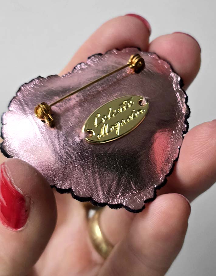 • Dos de la broche: épingle et fermoir doré, logo: plaque dorée Céleste Mogador