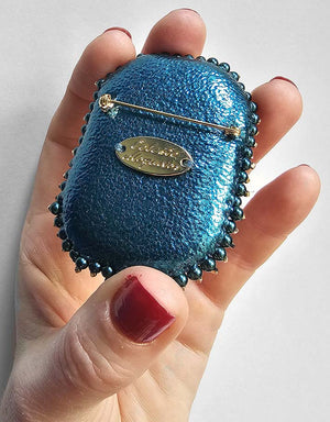 - Dos de la broche: épingle et fermoir dorés. Logo plaque dorée Céleste Mogador