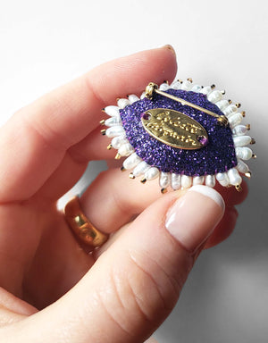 The eye is delicately hand-embroidered with colored silk threads. A row of freshwater pearls complete the details of this soon to be iconic piece of jewelry.