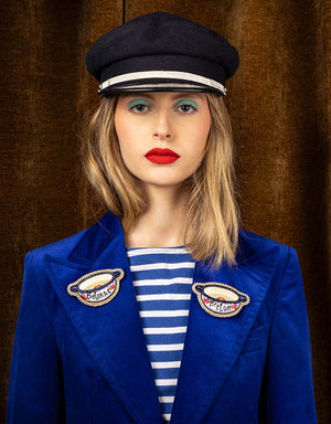 Spilla a scodella bretone ricamata nei colori tradizionali. Le parole "Bretonne" o "Breton" sono iscritte con orgoglio sulla ciotola, a ricordare la forte identità della regione.