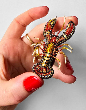 Una spilla a forma di scampo ricamata con fili iridescenti, ispirata alla nobile pesca del porto di Loctudy. Un pezzo raffinato e pieno di carattere.